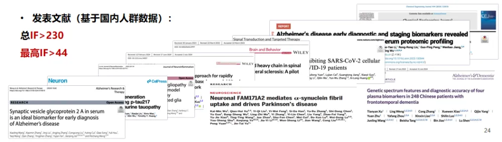 同時(shí),宇測(cè)生物樹立國(guó)內(nèi)AD血液生物標(biāo)志物學(xué)術(shù)影響旗幟,不斷推進(jìn)以神經(jīng)科學(xué)為核心的新型生物標(biāo)志物的臨床轉(zhuǎn)化與市場(chǎng)推廣,與國(guó)內(nèi)多家頭部醫(yī)院形成深度合作,發(fā)表多篇高影響力學(xué)術(shù)論文。目前在高端科研和頭部臨床單位已完成兩萬(wàn)多例血液樣本研究,參與多項(xiàng)國(guó)內(nèi)大型隊(duì)列研究,平臺(tái)累計(jì)發(fā)表IF>230,為神經(jīng)科學(xué)超敏血液生物標(biāo)志物的疾病的研究提供最強(qiáng)助力。